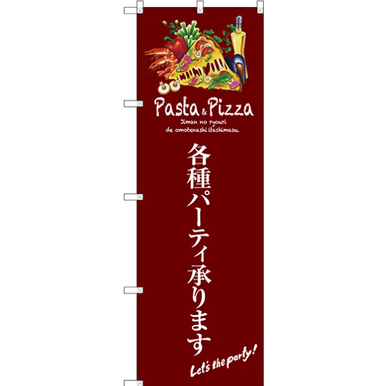 店舗やお店を盛り上げるのぼり旗。表示内容は、各種パーティ (赤)です。