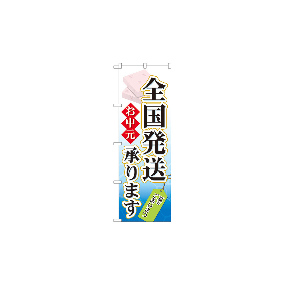 店舗やお店を盛り上げるのぼり旗。表示内容は、お中元 全国発送承りますです。