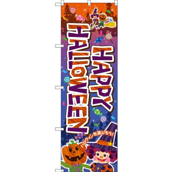 店舗やお店を盛り上げるのぼり旗。表示内容は、Happy Halloween (かぼちゃと魔女)です。