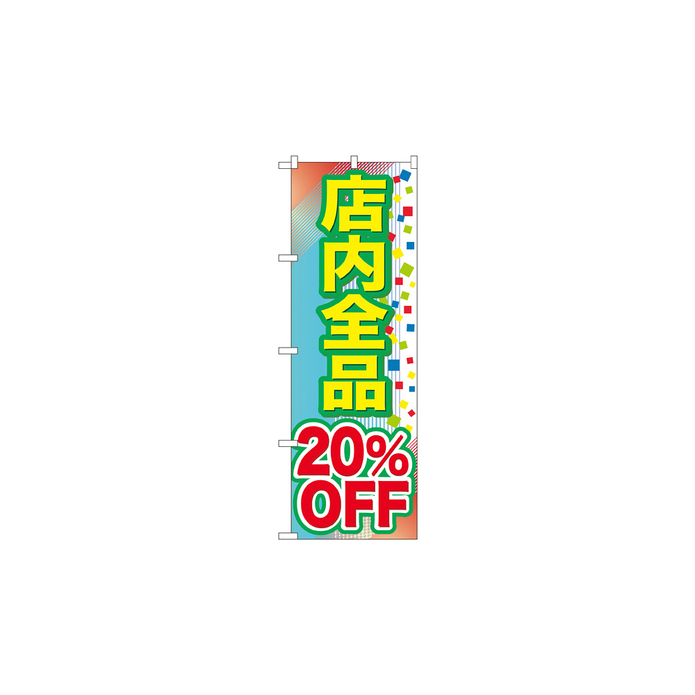 店舗やお店を盛り上げるのぼり旗。表示内容は、店内全品 20%OFFです。