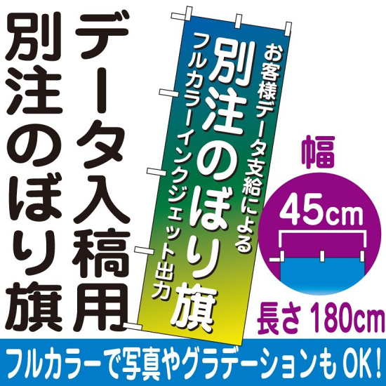 商品説明:別注のぼり旗製作 フルカラーインクジェット出力・ポンジ生地 ※要データ入稿 幅45cm×高さ180cm ※まとめ割価格はデータ1種類の場合です。