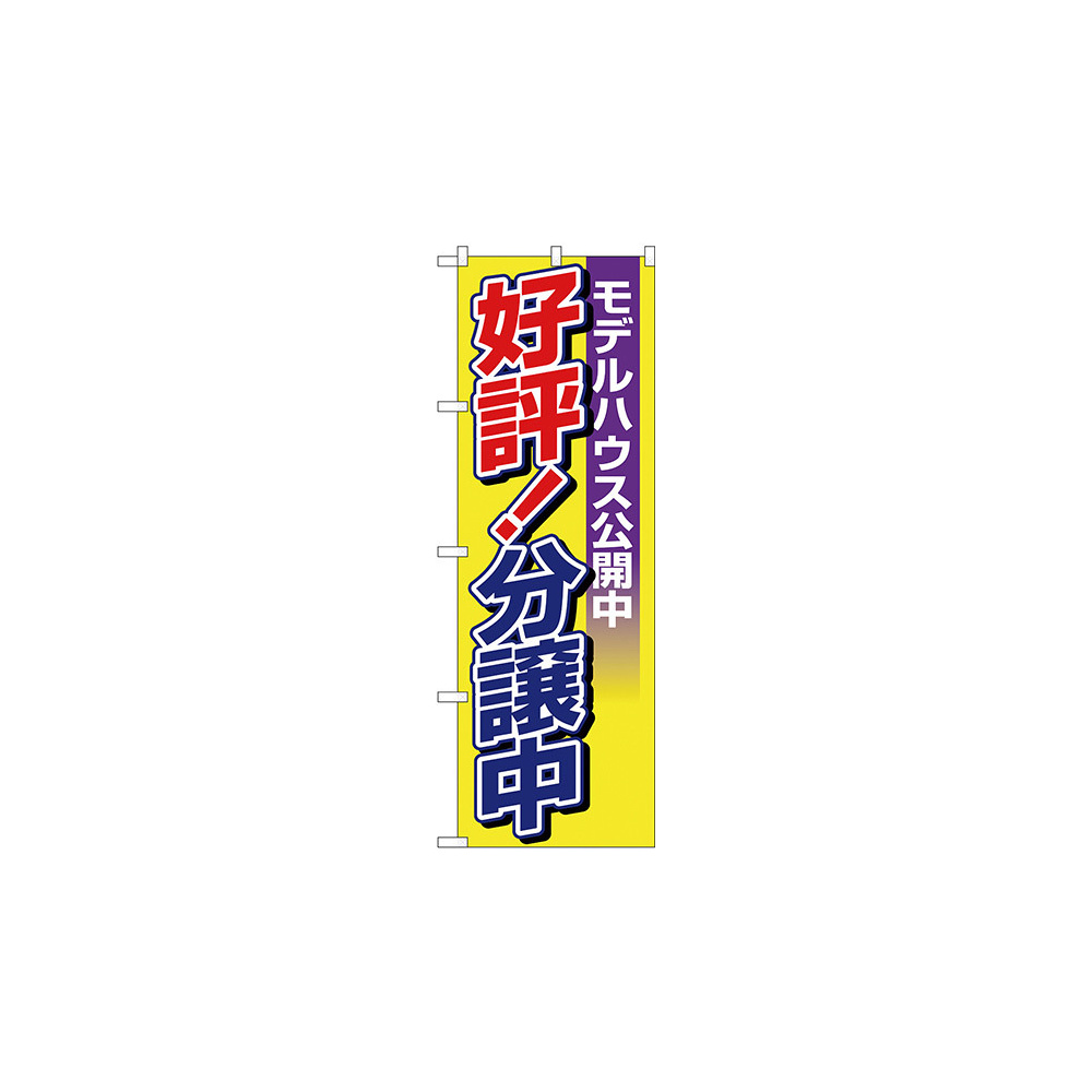 店舗やお店を盛り上げるのぼり旗。表示内容は、好評!分譲中 モデルハウス公開中です。
