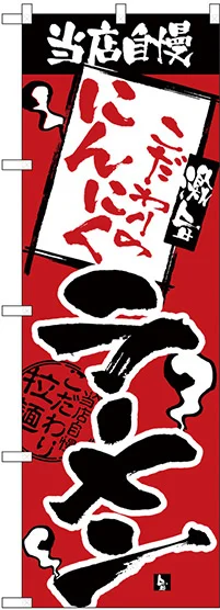 店舗やお店を盛り上げるのぼり旗。表示内容は、当店自慢 にんにくラーメンです。
