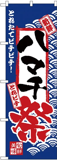 店舗やお店を盛り上げるのぼり旗。表示内容は、ハマチ祭です。