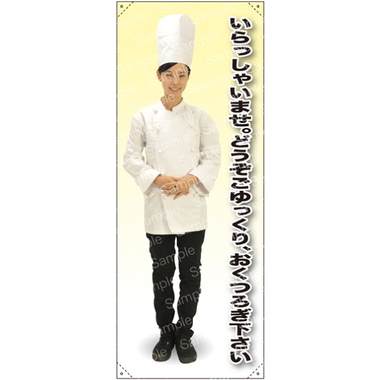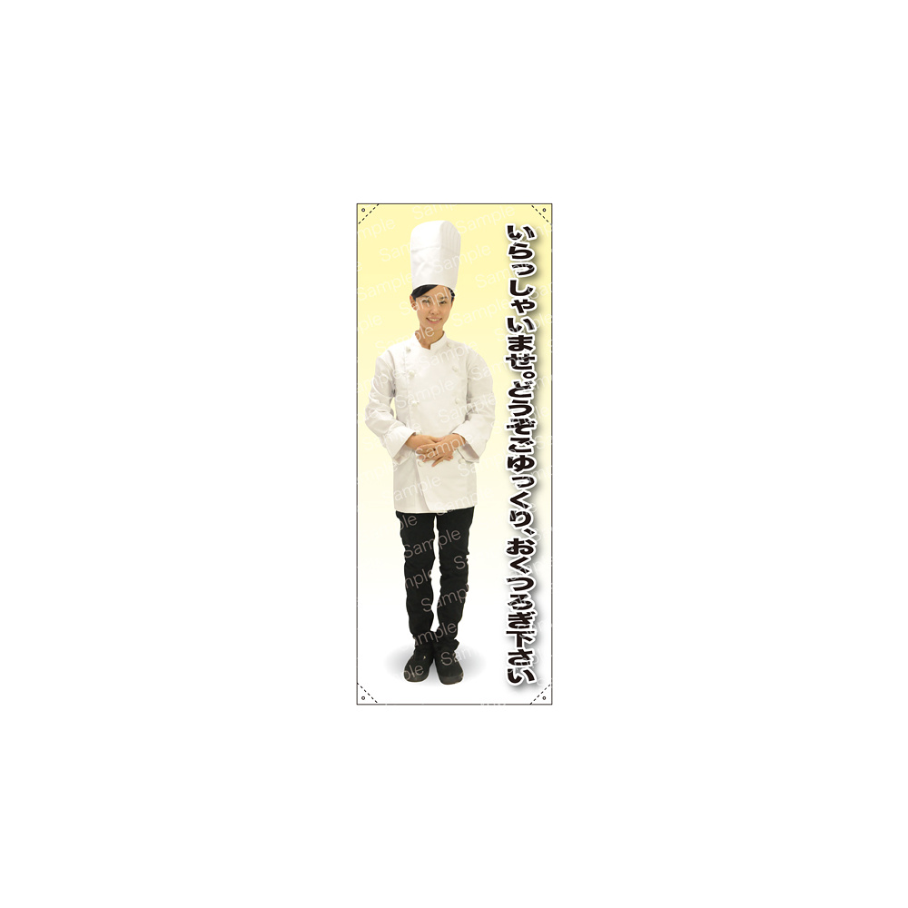 いらっしゃいませ。どうぞごゆっくり・・・ コックコート 等身大バナー 素材:トロマット(厚手生地) (62271)