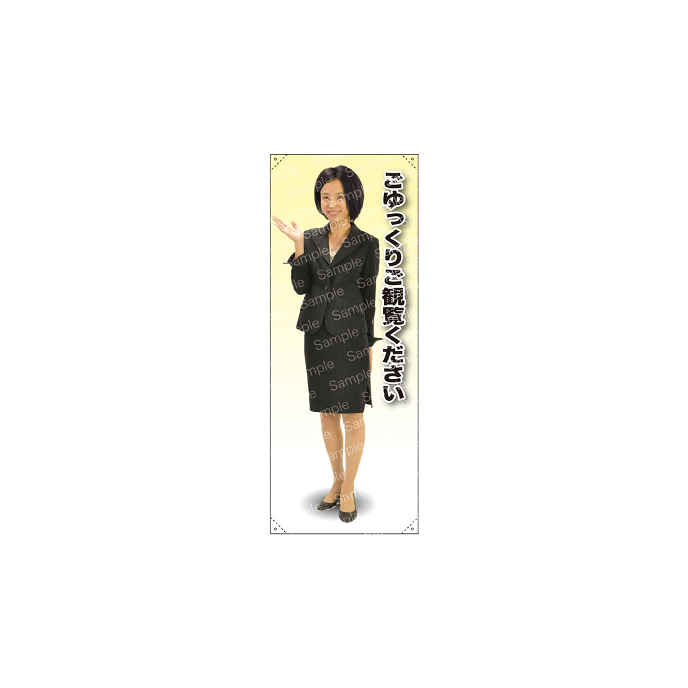 ごゆっくりご観覧ください 女性上着 等身大バナー 素材:トロマット(厚手生地) (62189)