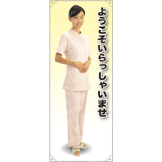 ようこそ 女性白衣セパレート(薄ピンク) 等身大バナー 素材:トロマット(厚手生地) (62259)の商品情報