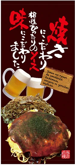 フルカラー店頭幕(懸垂幕) お好み焼 (写真・焼きにこだわり相性ぴったりのソース・・) 素材:ポンジ (67514) の商品詳細