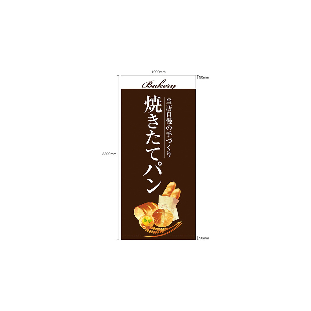 商品説明:フルカラー店頭幕(懸垂幕) 焼きたてパン 茶色地・イラスト付 素材:ポンジ (67780)