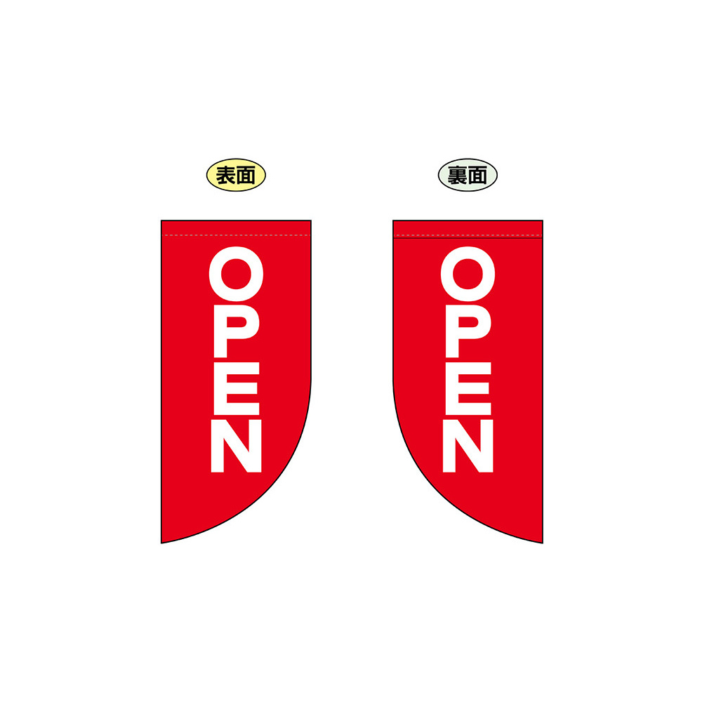 高さ550mmのショートタイプの高級遮光スエード素材に両面印刷した本格派販促フラッグ。表示内容「OPEN」