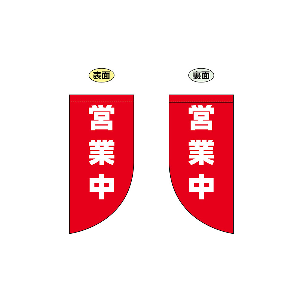 高さ550mmのショートタイプの高級遮光スエード素材に両面印刷した本格派販促フラッグ。表示内容「営業中」