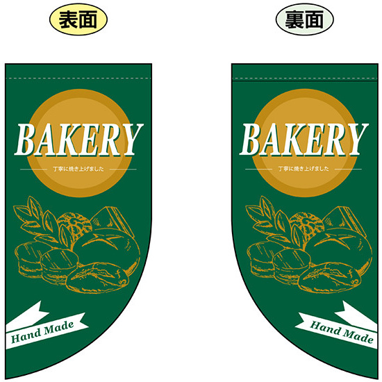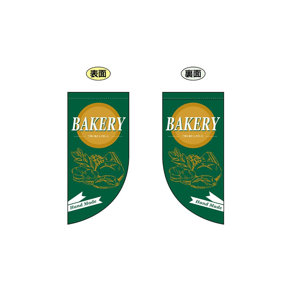 高さ550mmのショートタイプの高級遮光スエード素材に両面印刷した本格派販促フラッグ。表示内容「BEAKERY」