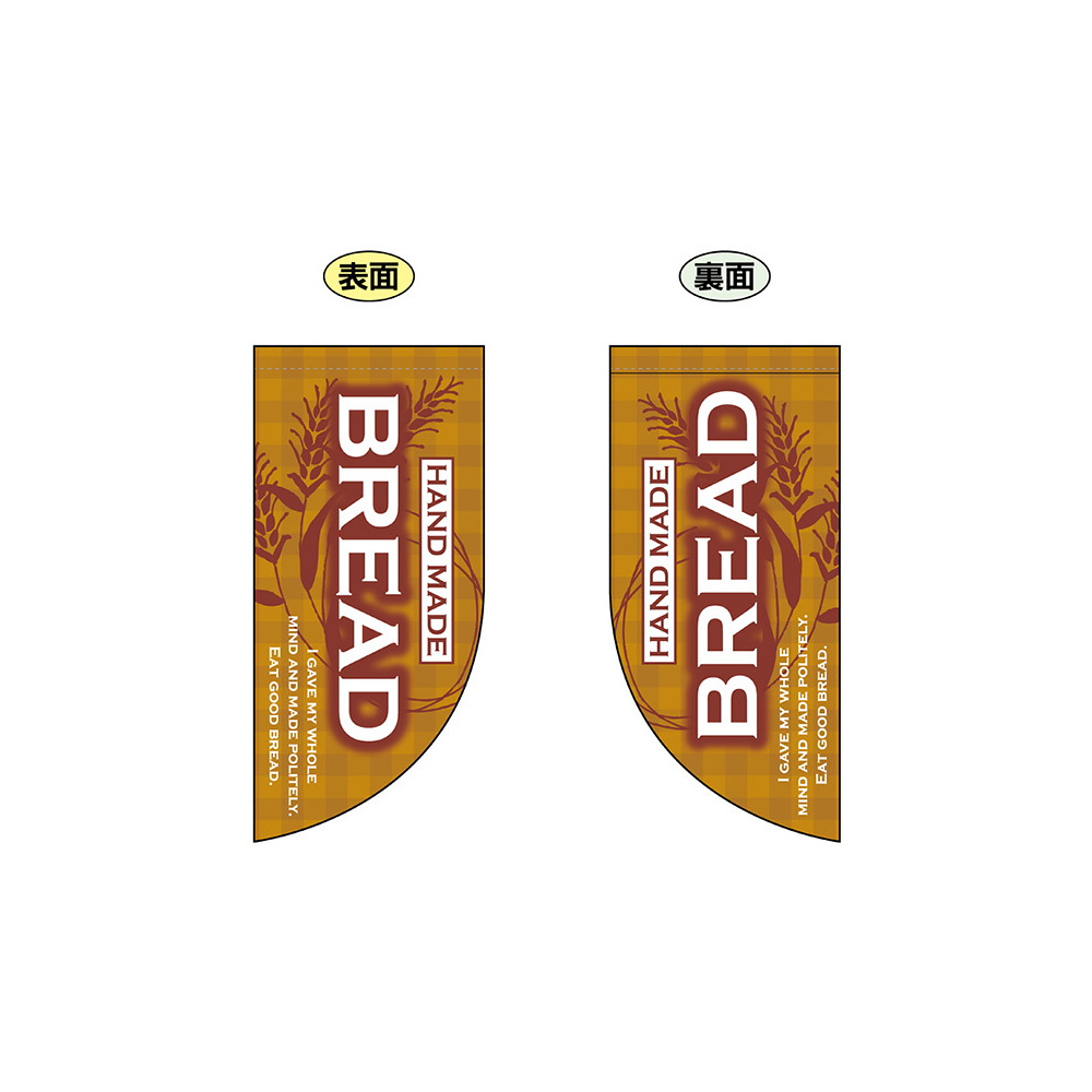 高さ550mmのショートタイプの高級遮光スエード素材に両面印刷した本格派販促フラッグ。表示内容「HAND MADE BREAD」