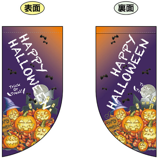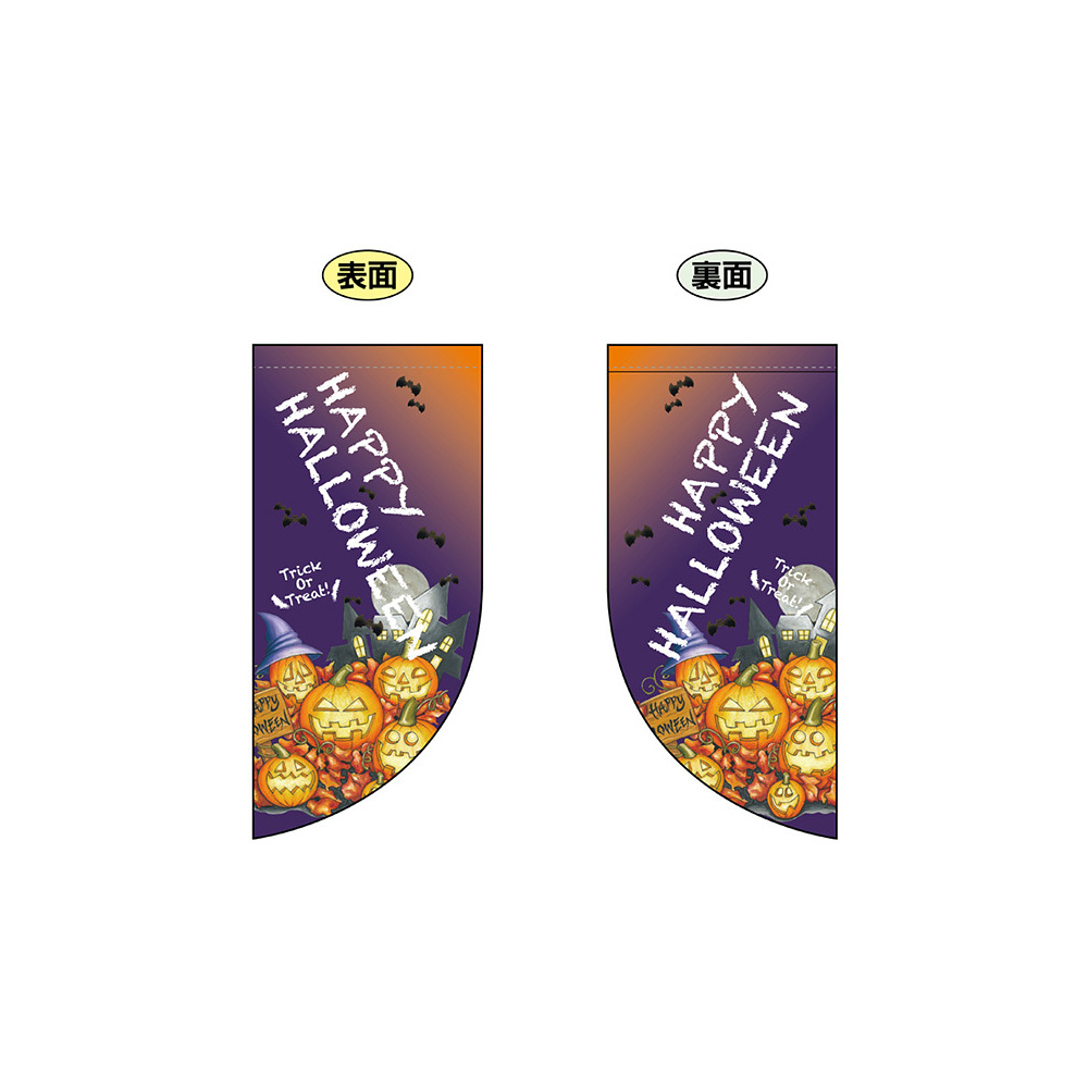 高さ550mmのショートタイプの高級遮光スエード素材に両面印刷した本格派販促フラッグ。表示内容「HAPPY HALLOWEEN」