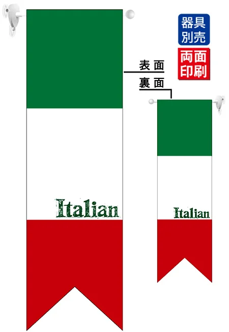 高さ850mmのロングタイプの高級遮光スエード素材に両面印刷した本格派販促フラッグ。表示内容「イタリア国旗ヨコ/Italia」