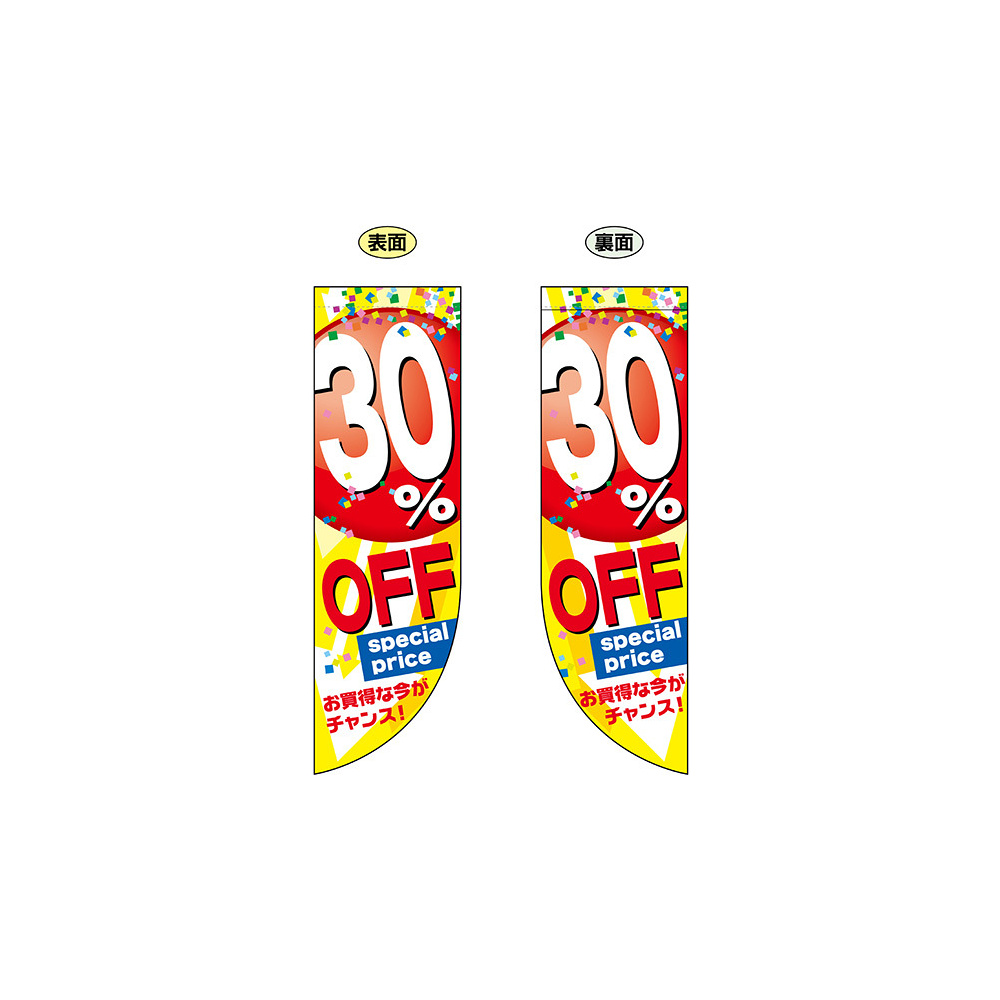 高さ850mmのロングタイプの高級遮光スエード素材に両面印刷した本格派販促フラッグ。表示内容「30% OFF」