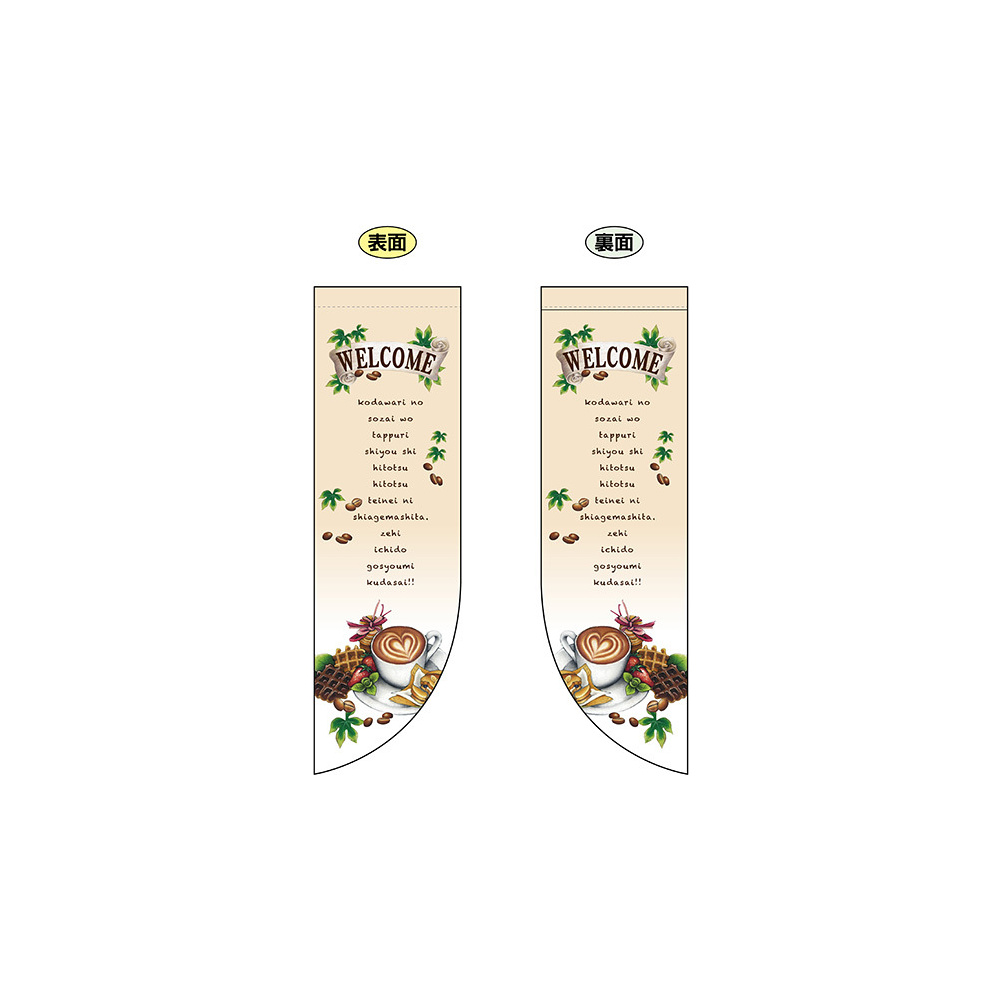 高さ850mmのロングタイプの高級遮光スエード素材に両面印刷した本格派販促フラッグ。表示内容「WELCOME」