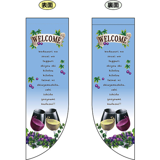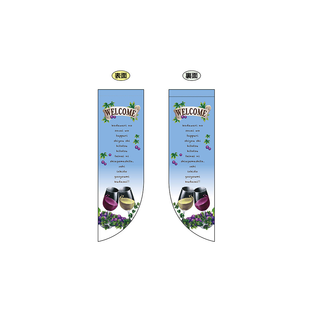 高さ850mmのロングタイプの高級遮光スエード素材に両面印刷した本格派販促フラッグ。表示内容「WELCOME」