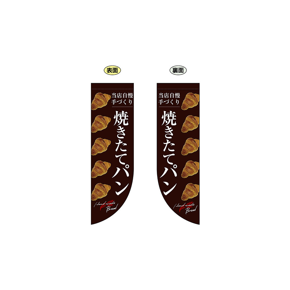 高さ850mmのロングタイプの高級遮光スエード素材に両面印刷した本格派販促フラッグ。表示内容「焼きたてパン」