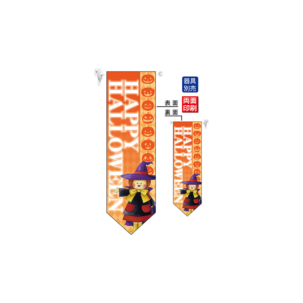 高さ850mmのロングタイプの高級遮光スエード素材に両面印刷した本格派販促フラッグ。表示内容「HAPPY HALLOWEEN」