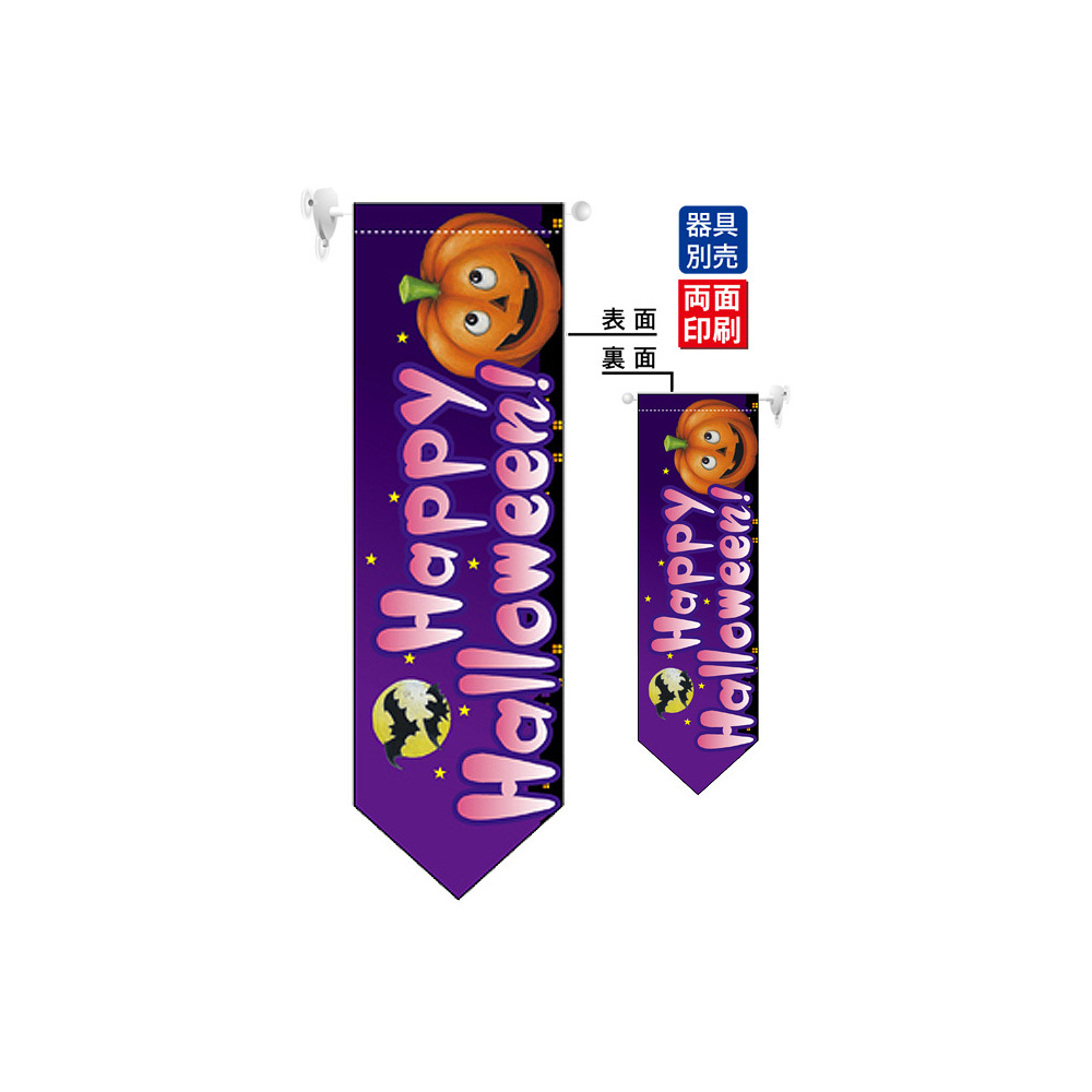 商品説明:Happy Halloween! (上段にカボチャ 左下に月の絵にコウモリ) フラッグ(遮光・両面印刷) (67740)