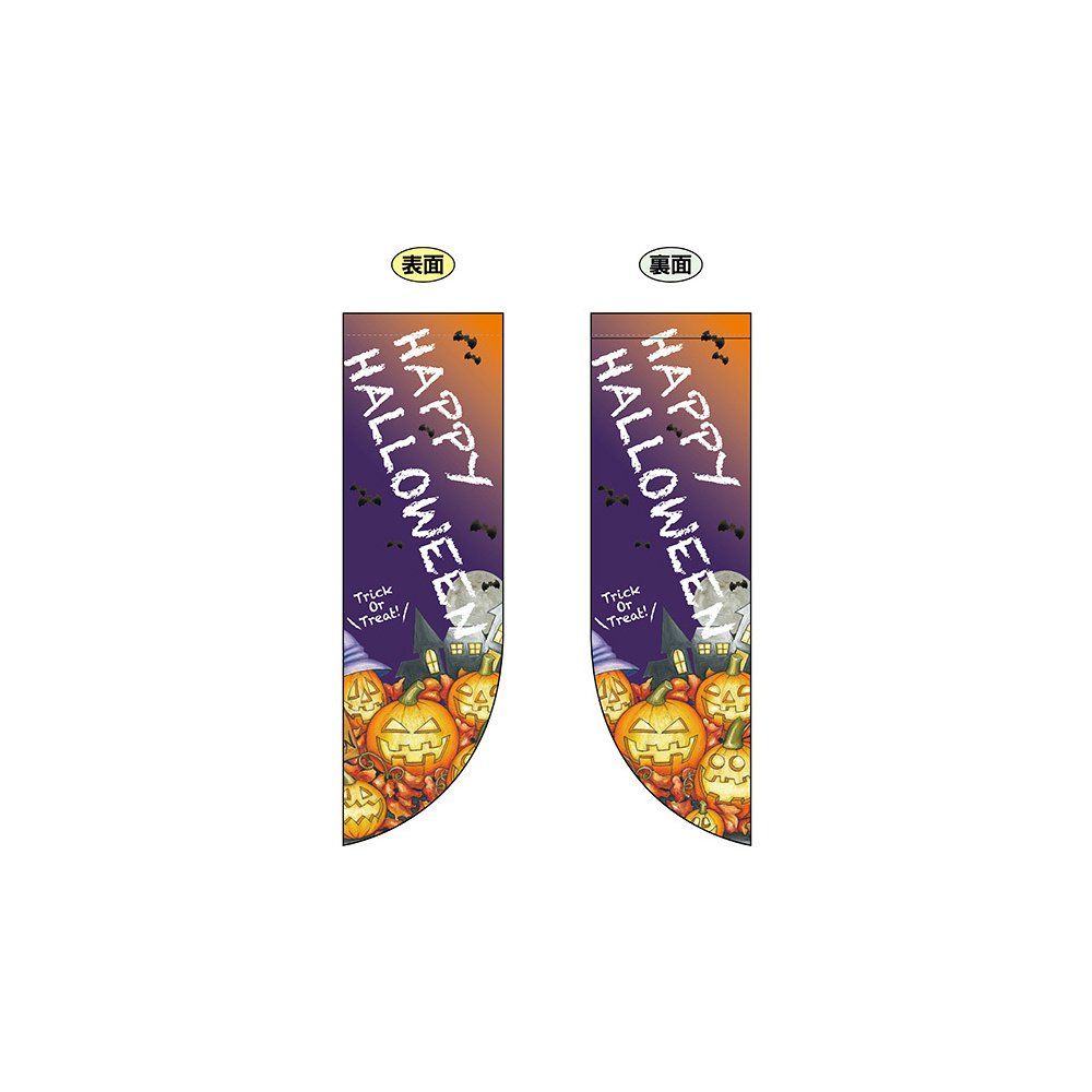 高さ850mmのロングタイプの高級遮光スエード素材に両面印刷した本格派販促フラッグ。表示内容「HAPPY HALLOWEEN」