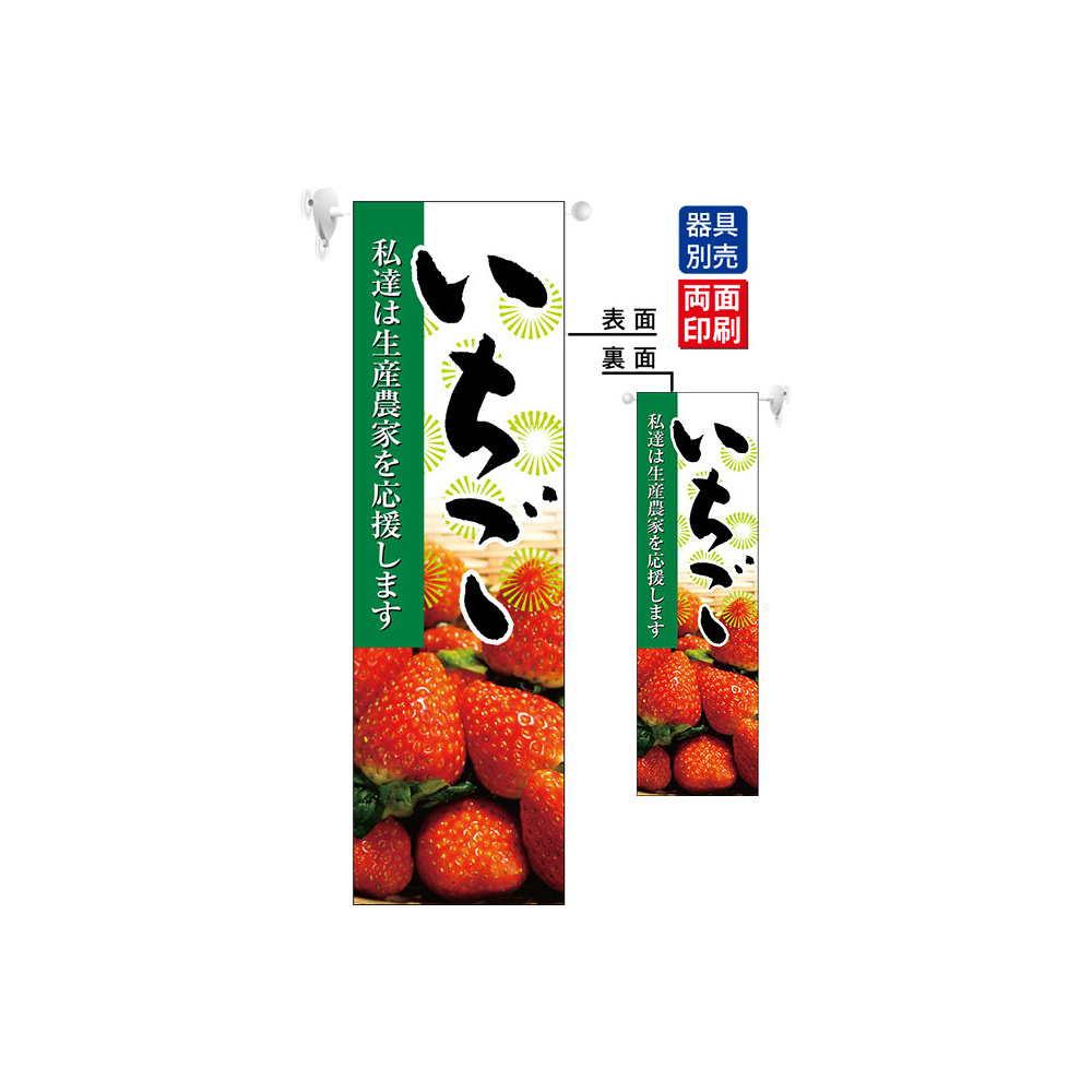 高さ850mmのロングタイプの高級遮光スエード素材に両面印刷した本格派販促フラッグ。表示内容「いちご」