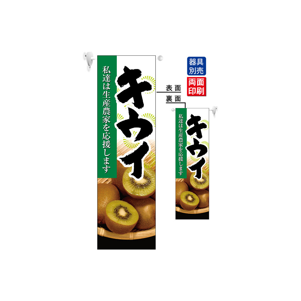 高さ850mmのロングタイプの高級遮光スエード素材に両面印刷した本格派販促フラッグ。表示内容「キウイ」