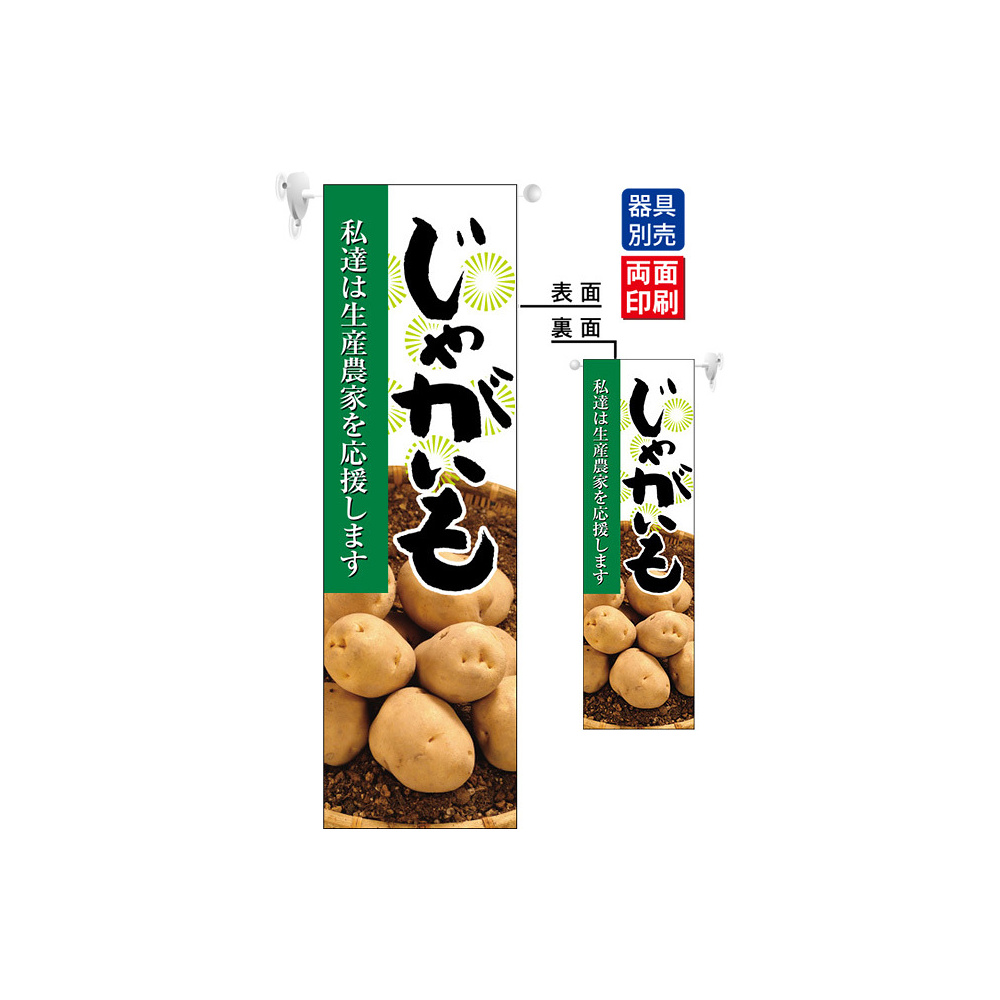 高さ850mmのロングタイプの高級遮光スエード素材に両面印刷した本格派販促フラッグ。表示内容「じゃがいも」