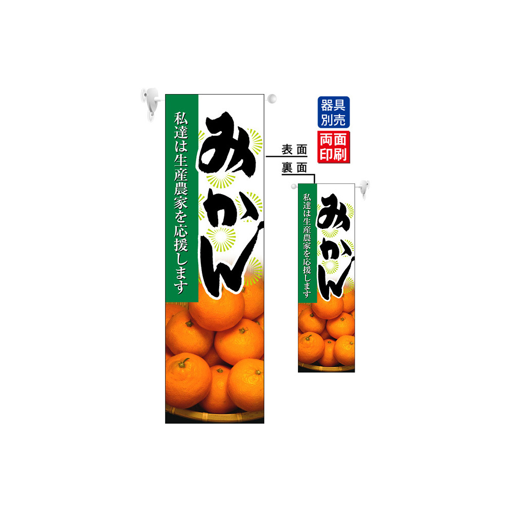 高さ850mmのロングタイプの高級遮光スエード素材に両面印刷した本格派販促フラッグ。表示内容「みかん」