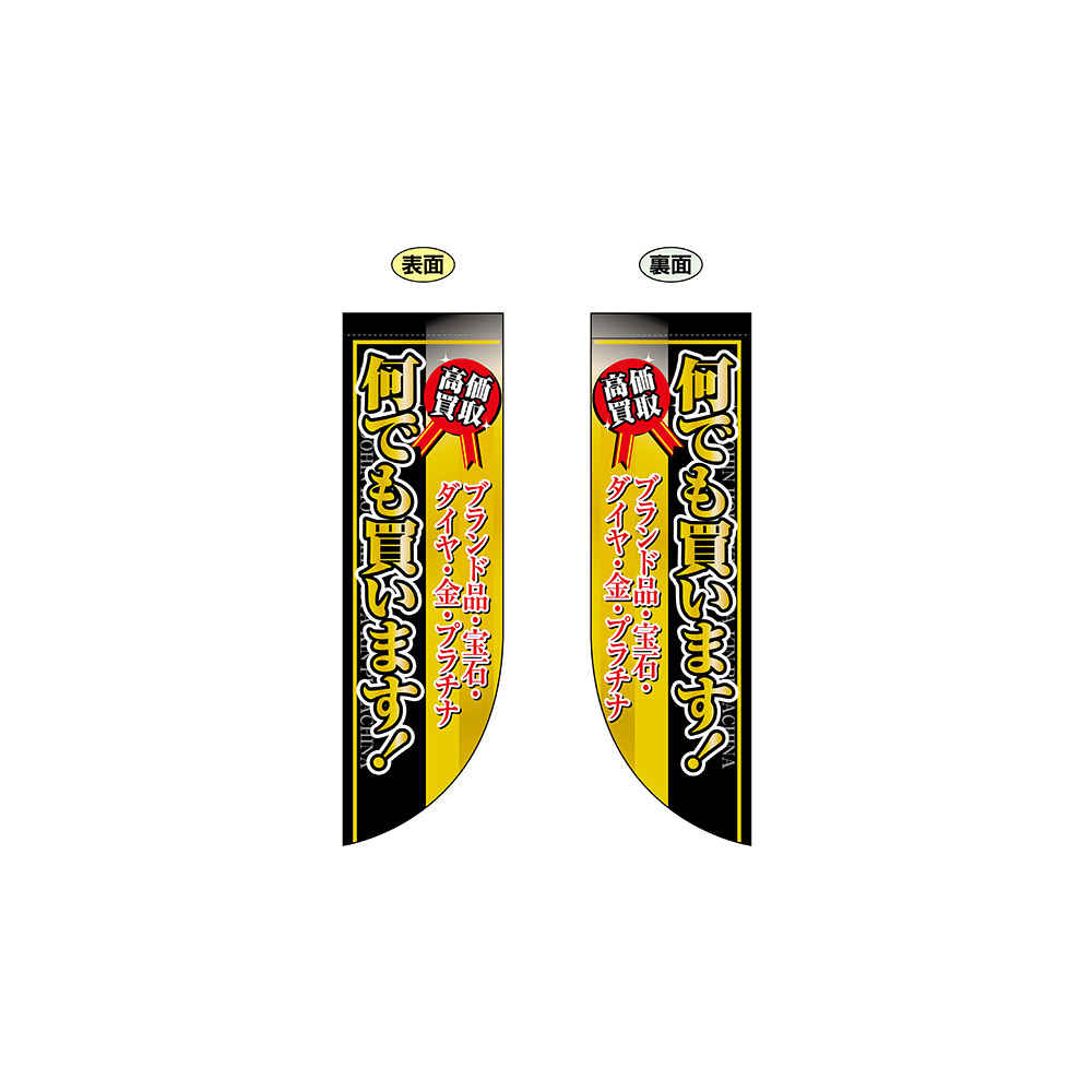 高さ850mmのロングタイプの高級遮光スエード素材に両面印刷した本格派販促フラッグ。表示内容「何でも買います!」