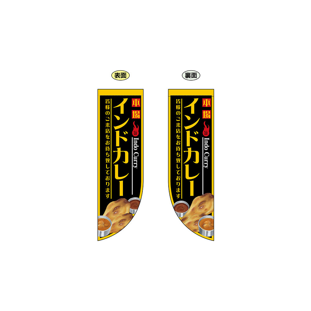 高さ850mmのロングタイプの高級遮光スエード素材に両面印刷した本格派販促フラッグ。表示内容「インドカレー」