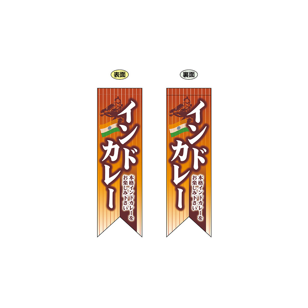 高さ850mmのロングタイプの高級遮光スエード素材に両面印刷した本格派販促フラッグ。表示内容「インドカレー」