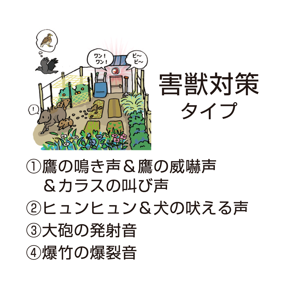 ■害獣対策向け音声 畑や家屋、農作物を荒らす害獣対策に。動物が嫌がる、警戒する音声を人感センサーで再生して撃退。
