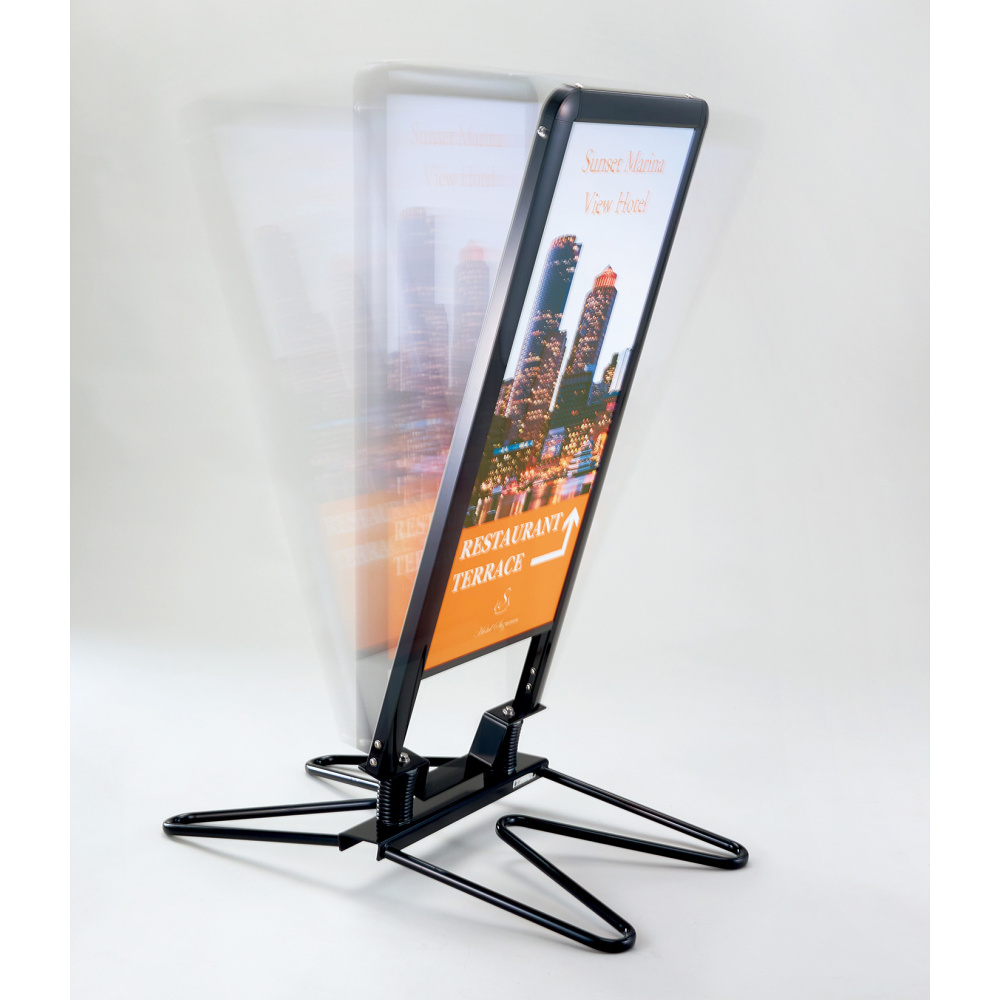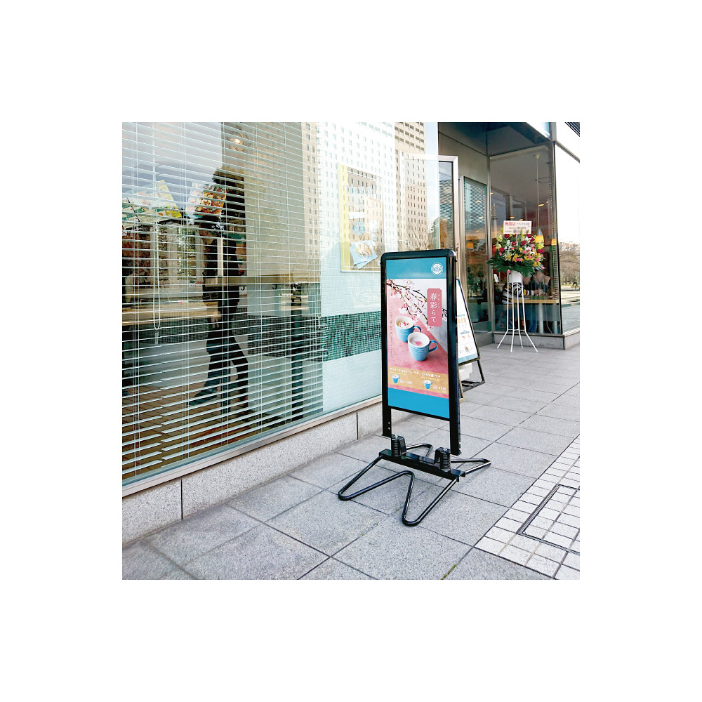 - スプリングで揺れるスイング式でありながら、水タンクのないスタイリッシュなデザイン。風を逃がす転倒防止機能と美観の両方を兼ね備え、コンパクトサイズでどこでも置きやすい魅力の詰まった屋外用スタンド看板です。