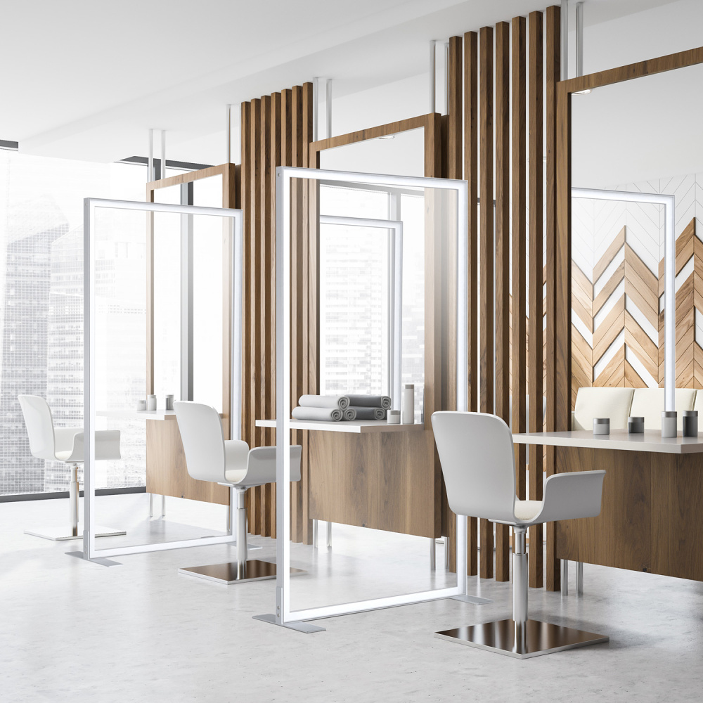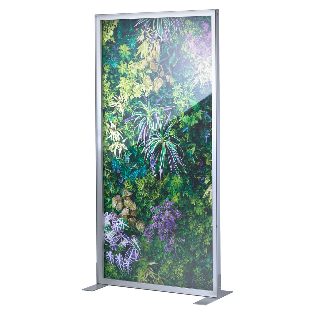 - 透明アクリル板入りのアクリルパーテーションとして。ファブリックメディアを取り付けグラフィックパネルとして。2つの機能を兼ね備えた新しい空間演出パーテーションです。