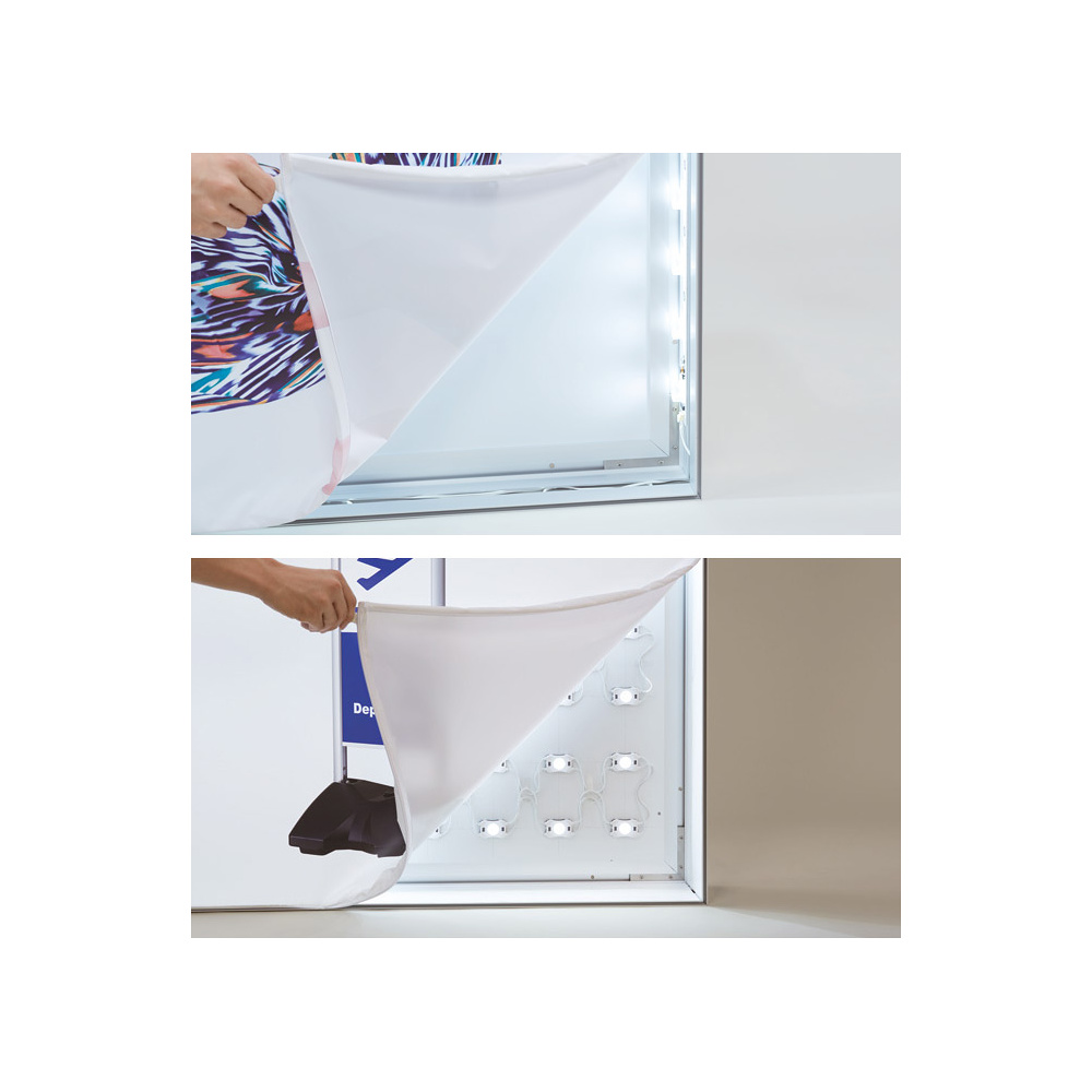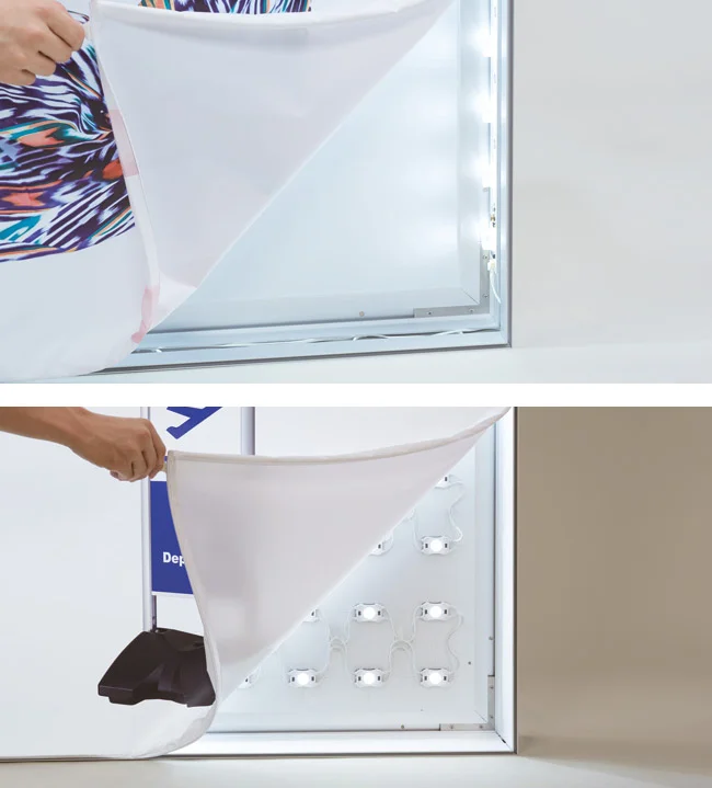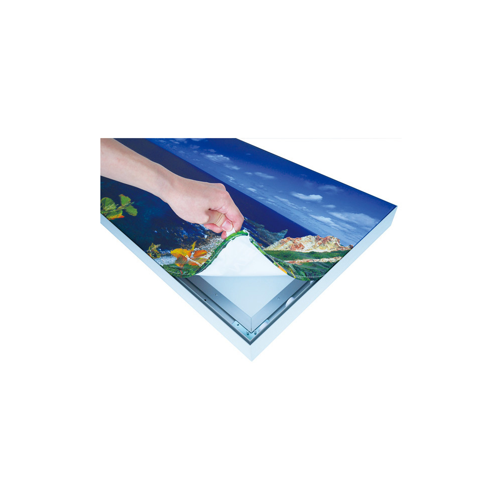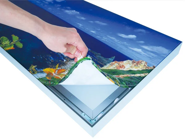 - ファブリックフレーム(パネル)はファブリック(合成繊維の布地)メディアにグラフィックを印刷し軽量アルミフレームにテンションをかけて掲示するテンションファブリックシステムです。