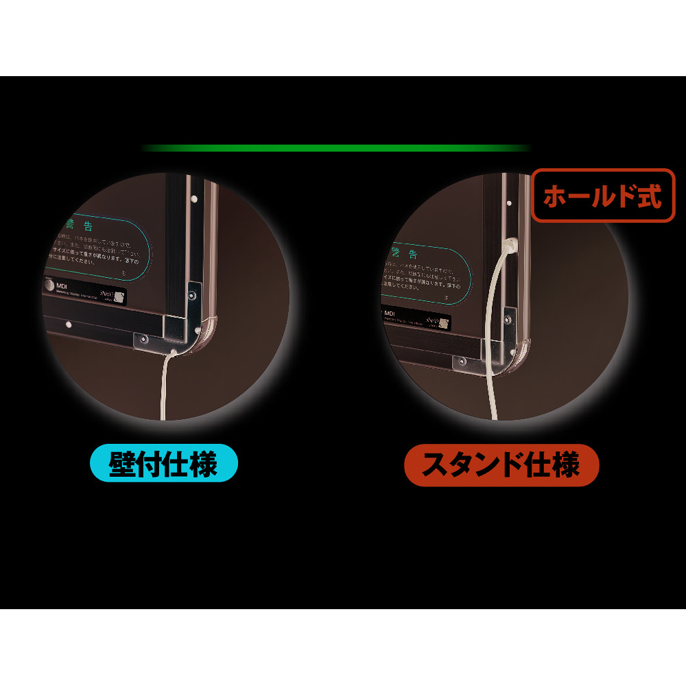 - 電源コードの壁面設置時の配線がきれいに収まる「壁付仕様」と、イーゼル等のスタンド設置時の破損を防ぐ強化型「スタンド仕様」の2タイプをご用意。