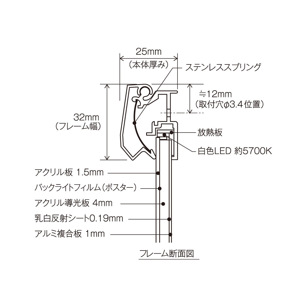 - LED色温度は5700K・演色性Ra80以上で人物等様々なグラフィックを自然な発光で表現します。