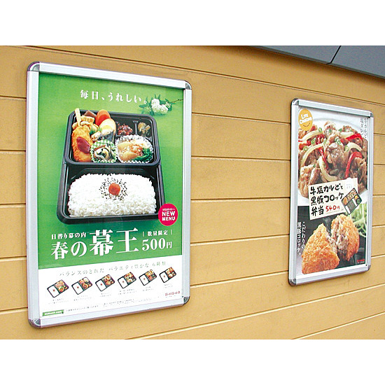 - 壁面に取付けたまま、手でフレームが開けられて、ポスター入れ替えができる4辺開閉式のポスターフレームです。