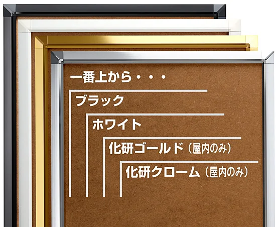 - 壁面に取付けたまま、手でフレームが開けられて、ポスター入れ替えができる4辺開閉式のポスターフレームです。