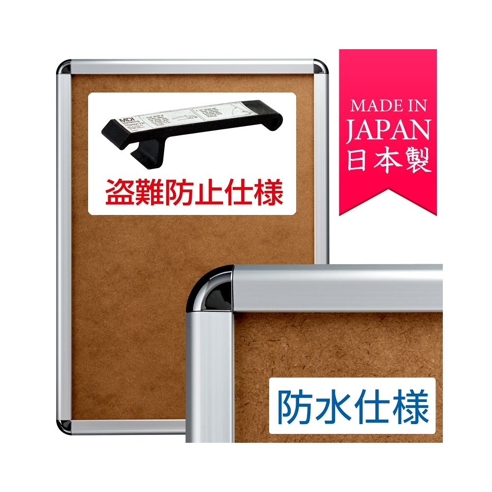 - 壁面に取付けたまま、専用オープナーで開けられて、ポスター入れ替えができる4辺開閉式のポスターフレームです。