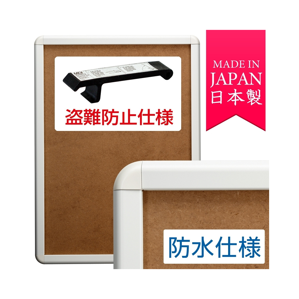 - 壁面に取付けたまま、専用オープナーで開けられて、ポスター入れ替えができる4辺開閉式のポスターフレームです。