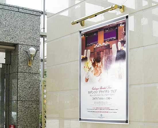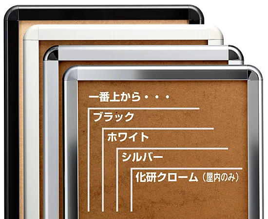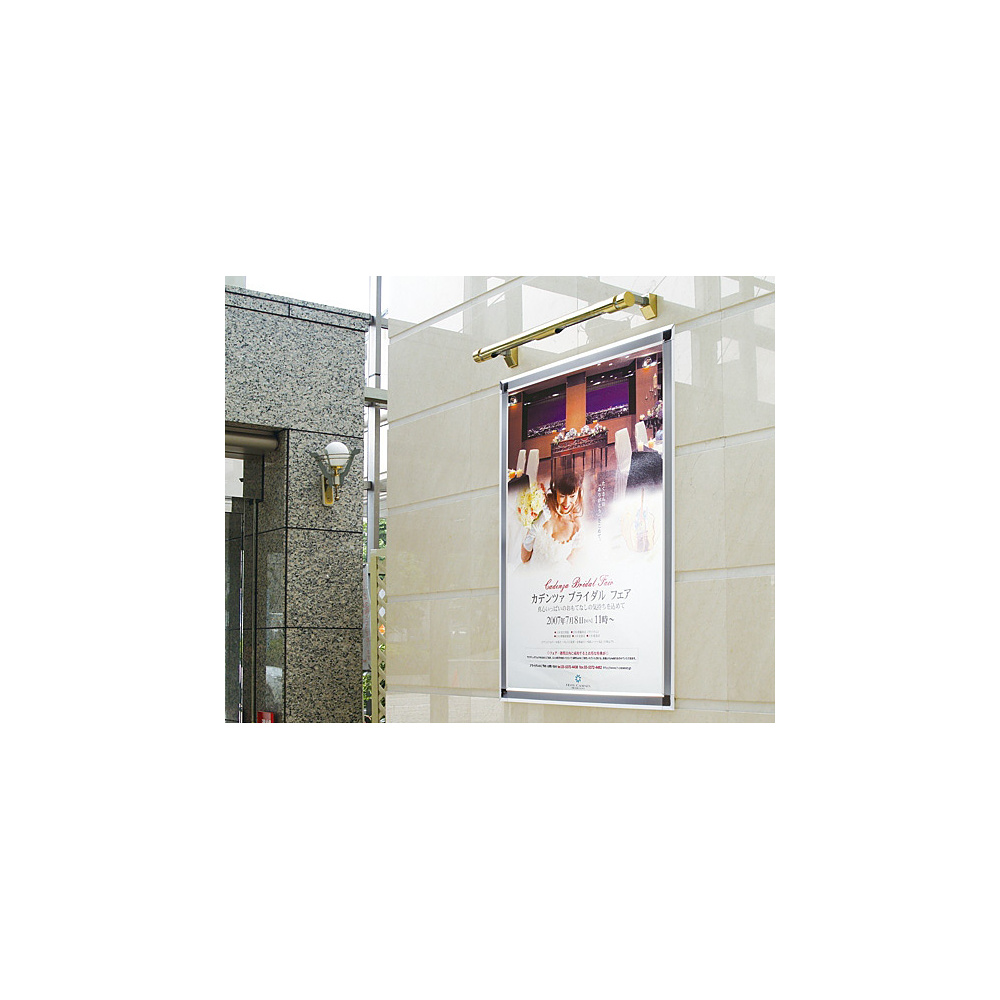 - 壁面に取付けたまま、専用オープナーで開けられて、ポスター入れ替えができる4辺開閉式のポスターフレームです。