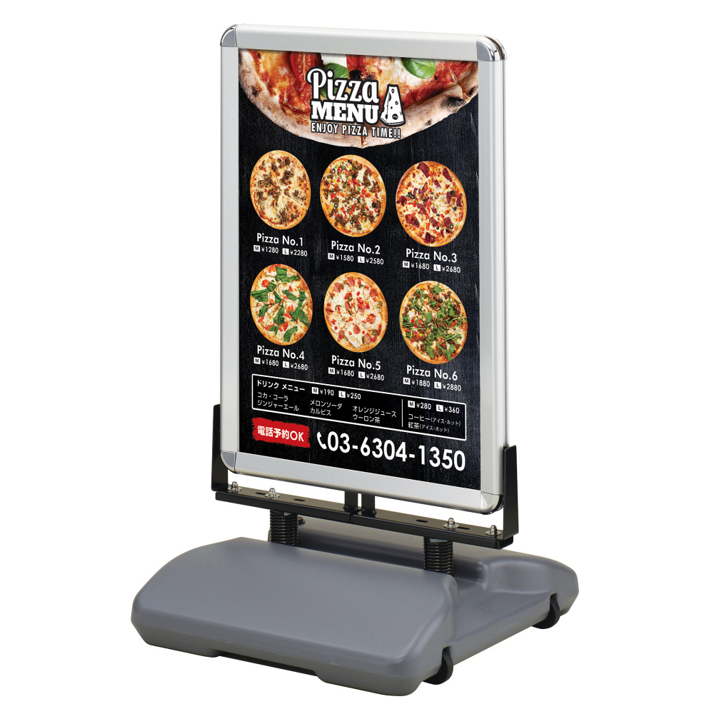 - 風に強い、非内照式の全天候型スイング式両面パネルスタンド。