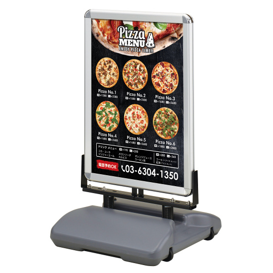 雨にも負けず、風にも負けない!全天候型スイング式両面スタンド。