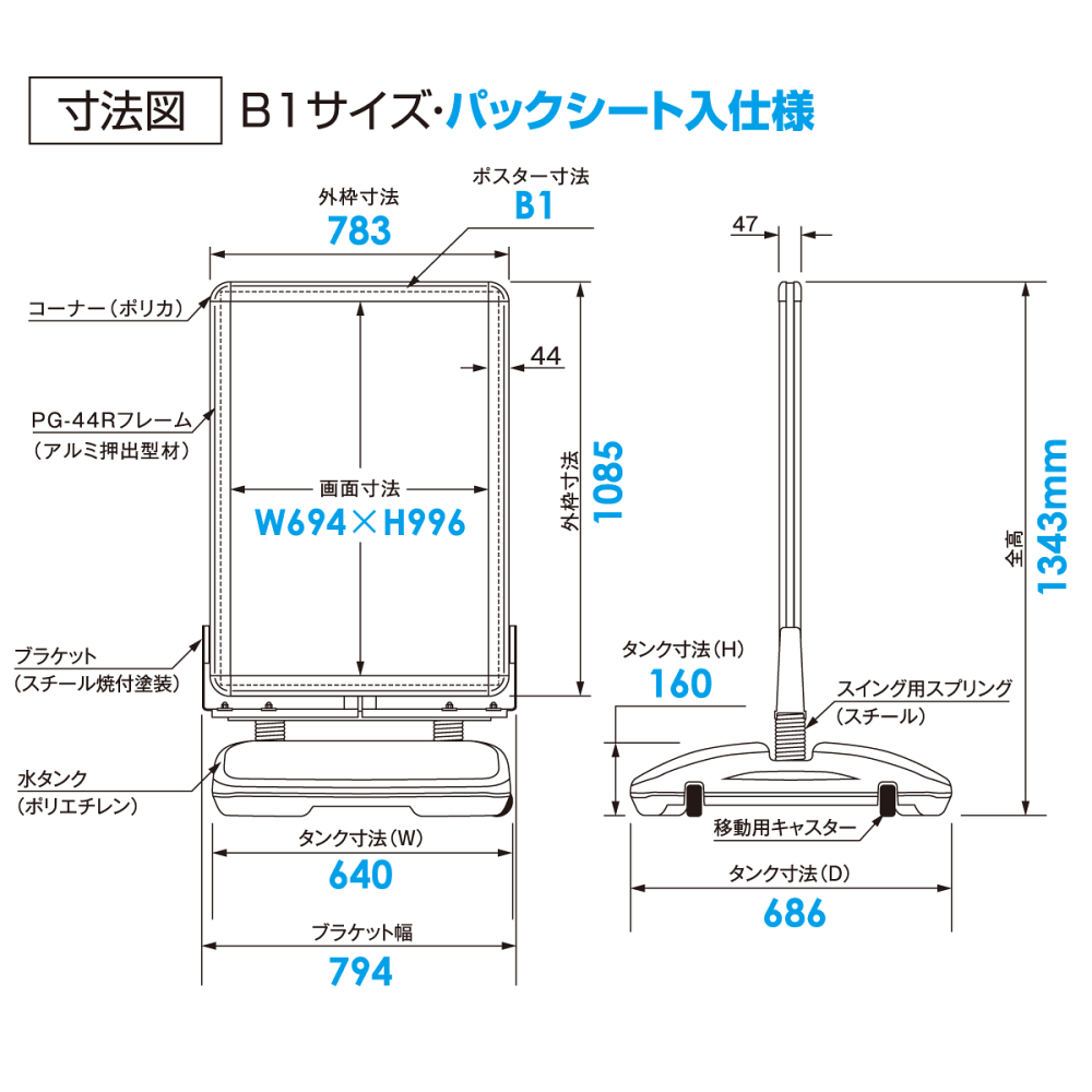 商品説明:ローリングベース たおれん君 スイング式両面看板 B1 防水パック シルバー (RB-PAC-PG44R-B1-AG)
