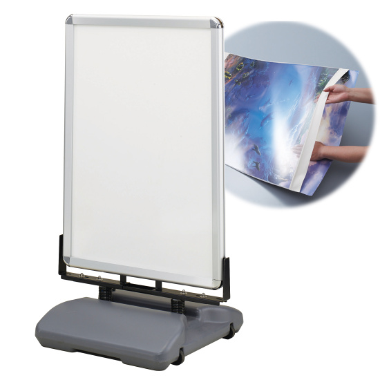 - 風に強い、非内照式の全天候型スイング式両面パネルスタンド。