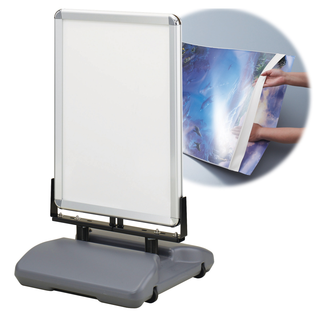 - 風に強い、非内照式の全天候型スイング式両面パネルスタンド。