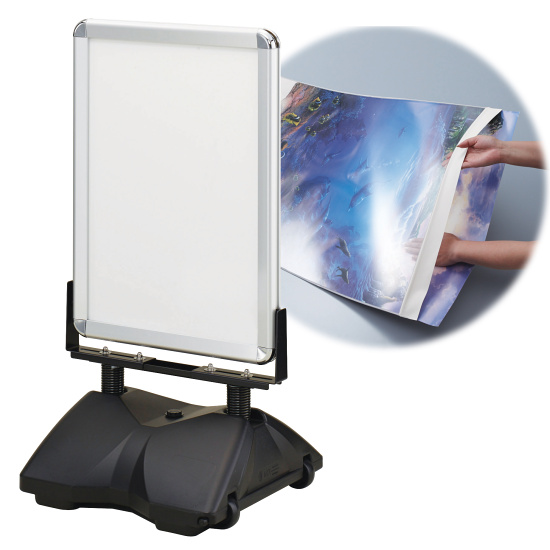 - 風に強い、非内照式の全天候型スイング式両面パネルスタンド。